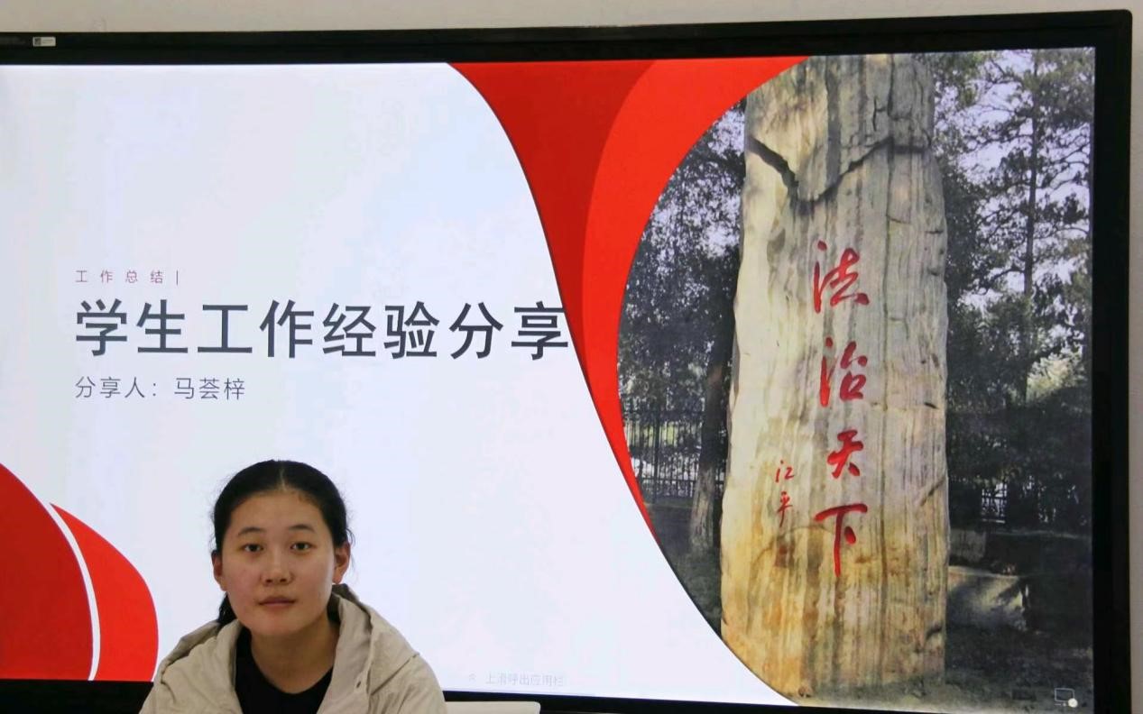 首先,马荟梓给同学们分享了她的充满汗水与收获的学生工作经历。从大一到大三、再到研一再次接手学生工作,马荟梓深切体会到一路上不仅有令人艳羡的鲜花与掌声,更有数不尽的辛苦。在这段经历中,她收获了许多工作技能,也培养了为人处世的良好心态。