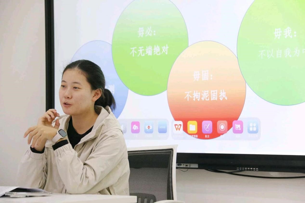 她分享的第二点心得是“子四绝:毋意,毋必,毋固,毋我”。这也是她认为对于提高学生干部个人修为最为重要的四个方面。“毋意”即不凭空臆测,她提醒大家,工作时要从实际出发,要在对工作内容有过了解后再进行分配,不能主观臆断,随意分配;如果管理的部门较多,做不到对所有部门的工作都有所了解,就应该多加听取其他部门负责人的意见。“毋必”,原意为“不无端绝对”,放在工作中就是“不要求一件事情一定要做到怎样的结果”。诚然,做学生工作应该力求尽善尽美,但是当任务难度明显超出同学们的能力范围时,应该及时跟老师沟通,说明大家的难点、痛点,争取机会让大家在能力范围内把工作做到最好。“毋固”,就是在工作中不固执于自己的成见。在工作中,既要知人善任,也要多倾听同学们的想法,善于采纳好的建议,激发大家的创新活力,让每位同学都成为部门发展的推动者。“毋我”,即要做到“己所不欲,勿施于人”。学生干部不能只做高高在上、发号施令的人,而是要在把自己分内的事情做好的前提下,努力帮助部门内的同学解决问题。遇到难题时敢于迎难而上,起到带头作用,不能逃避。她强调,“子四绝:毋意,毋必,毋固,毋我”这句话也可以跟之前的“君子不器”结合起来理解,即我们在做学生工作时不应该拘泥于各种条条框框,而是要勤于思考、灵活变通,处理好自己跟部门内各位同学的人际关系,并且在合法合规的范围内最大限度地激发大家的动力和创新活力,让每个人都积极参与工作,激发整个学生组织或班集体运转的活力。