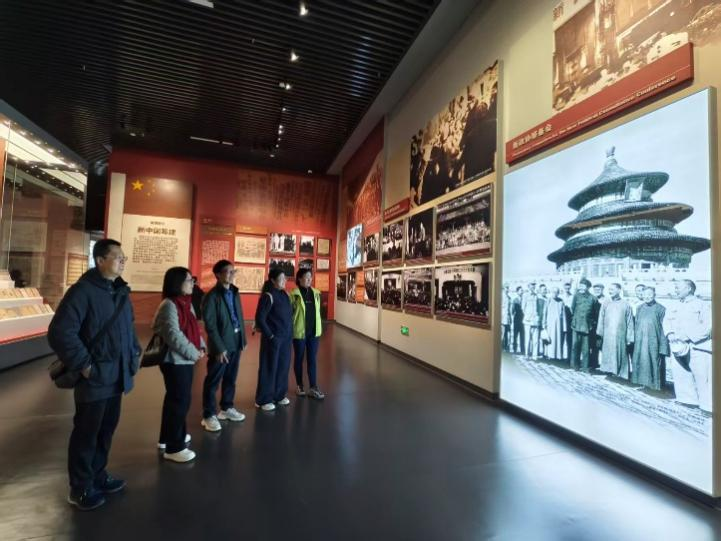 教师们依次参观了《为新中国奠基 —— 中共中央在香山》基本陈列展区,通过珍贵文物、历史照片、场景复原等丰富史料,系统回顾了 1949 年中共中央进驻香山后,指挥渡江战役、筹建新中国、团结各民主力量等重大历史进程。在 “渡江战役” 展区前,毛泽东同志亲自撰写的《人民解放军百万大军横渡长江》新闻手稿复制品引得教师们驻足细观,大家结合法律英语专业特点,热议革命历史文献的跨语言传播价值;在《论人民民主专政》陈列专柜前,教师们围绕 “人民主权”“法治初心” 等核心思想展开交流,深刻体会到新中国法治建设的历史根基。