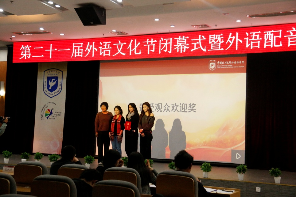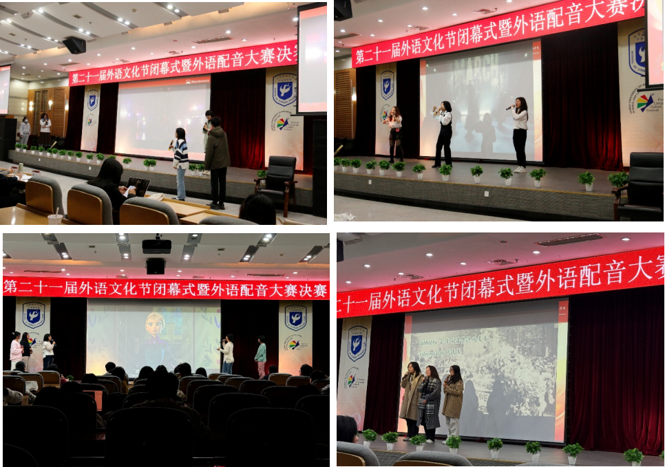 经过激烈的角逐,外语配音大赛中《珀尔》组和《frozen》组荣获一等奖;《魔法满屋&西尔维亚》组、《灰姑娘》组和《妇女参政论者》组荣获二等奖;《头脑特工队》组、《葬送的芙莉莲》组、《疯狂动物城》组、《闻香识女人》组和《功夫》组荣获三等奖。在现场师生观众票选推荐下,《灰姑娘(英语)》荣获“最受观众欢迎”奖,《珀尔》组荣获“最佳语音”奖。
